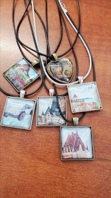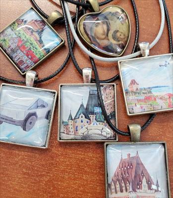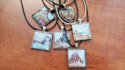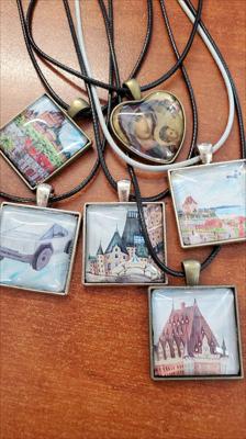 Les pendentifs sur cordons multicolores, ornés de reproductions de tableaux de notre galerie, sont de grande taille.