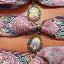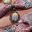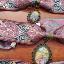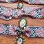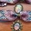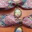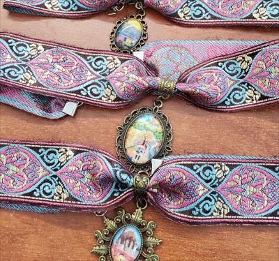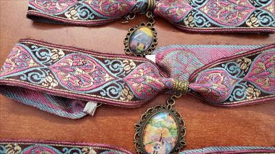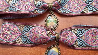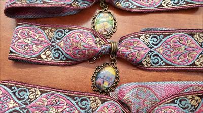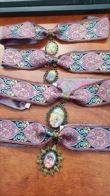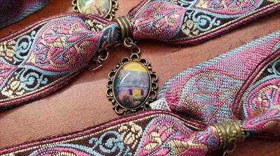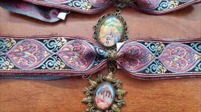 Colliers ras du cou en laiton avec ruban rose coloré orné de reproductions de nos tableaux de différentes formes