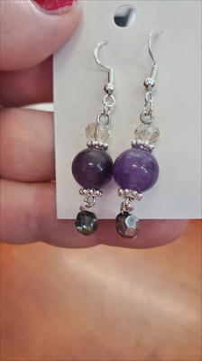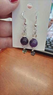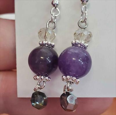 Boucles d'oreilles en pierres violettes naturelles ornées de cristaux Swarovski sur des supports en argent.