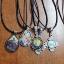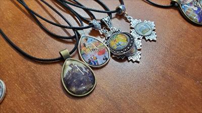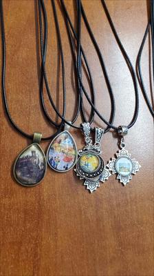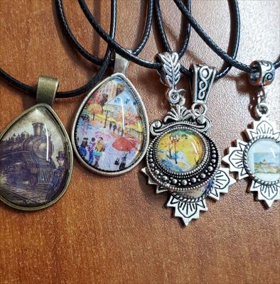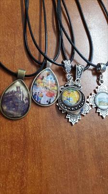 Un pendentif orné d'une reproduction d'un tableau de la galerie ArtKela, sur une forme à multiples facettes et muni d'un cordon noir.